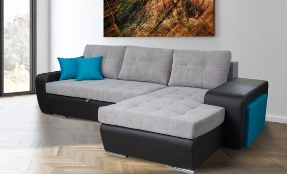 Grup colt extensibil cu o linie moderna, avand cusaturi ornamentale pe brate si sezut, L 265 x 165 cm, extensie sertar 130 x 210 cm, lada asternut pal alb, balama cu arc, perne...