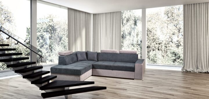Coltar extensibil cu o linie moderna, avand cusaturi ornamentale pe brate si sezut, tetiere fixe, brate reglabile in mai multe pozitii, L 260 x 189 cm, extensie sertar 125 x 200 cm, lada...
